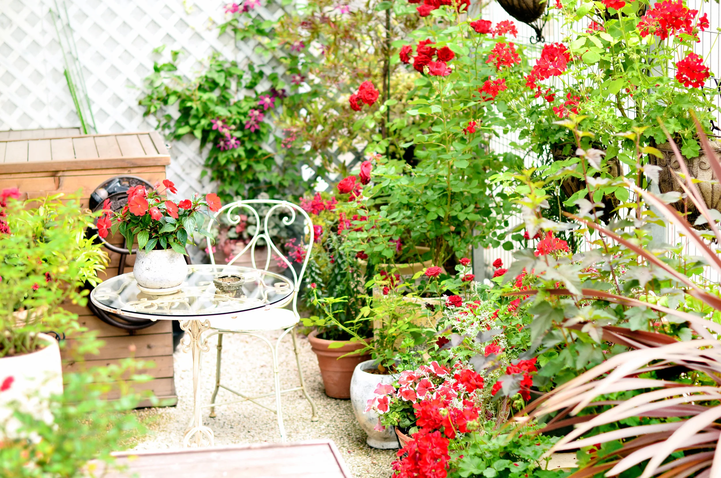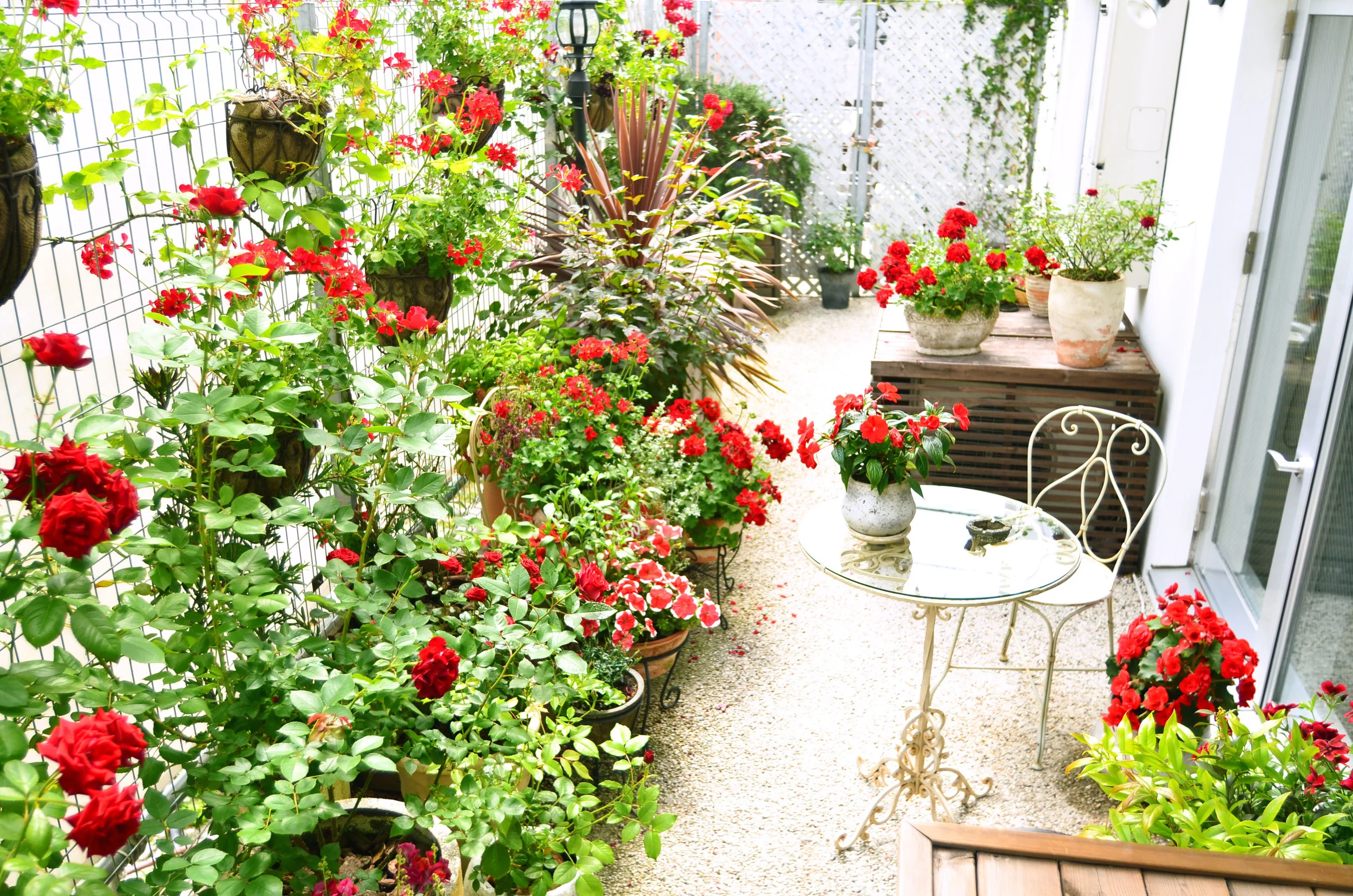 こだわりのアンティーク、ガーデンテラスにはRossAの名に由来し、赤い花々がお客様をお出迎え致します。