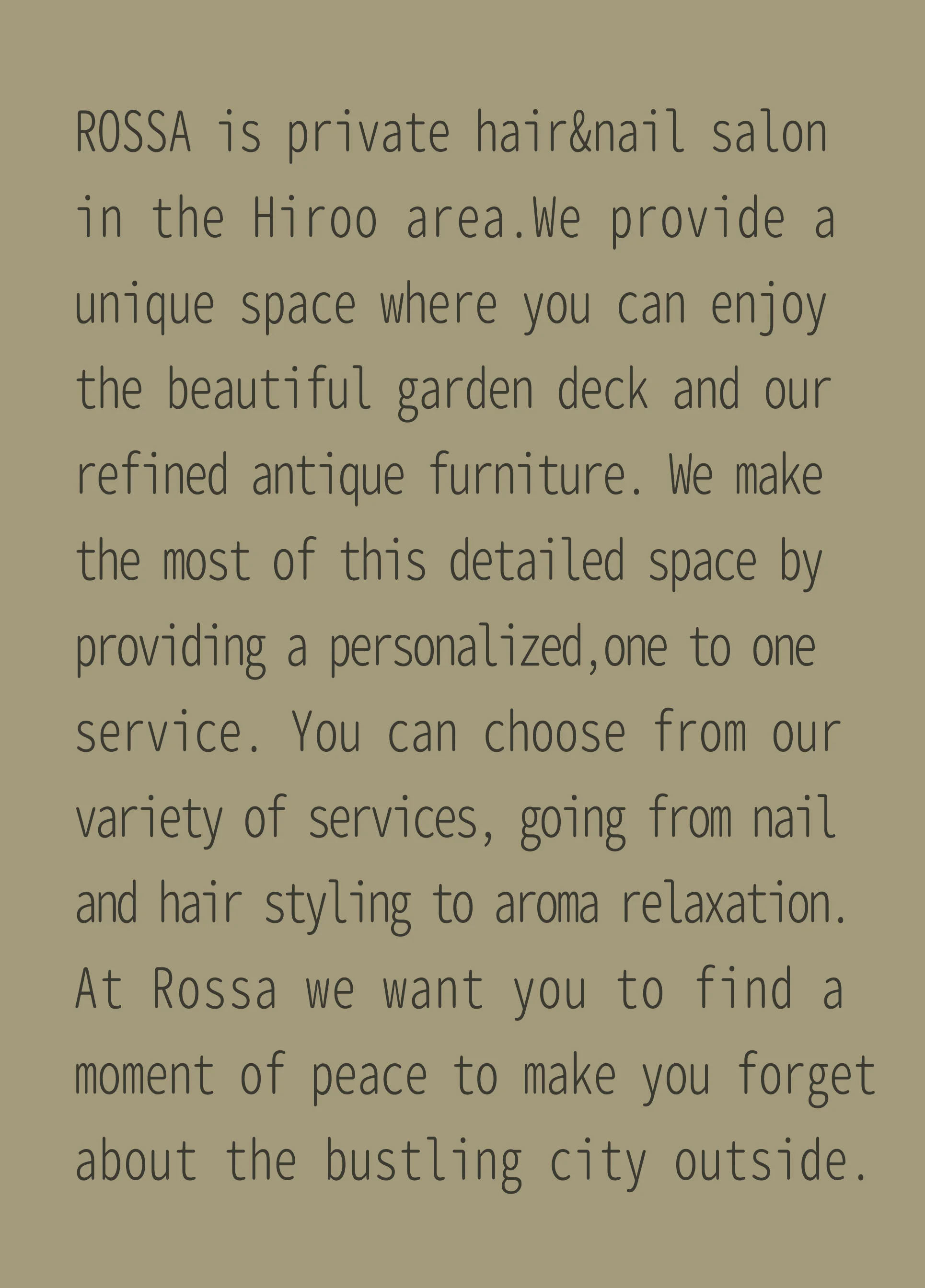 お客様お一人お一人の髪・爪・頭皮・肌・心 ・こだわりにあったご相談 ご提案をさせて頂く事をRossAはお約束致します。
